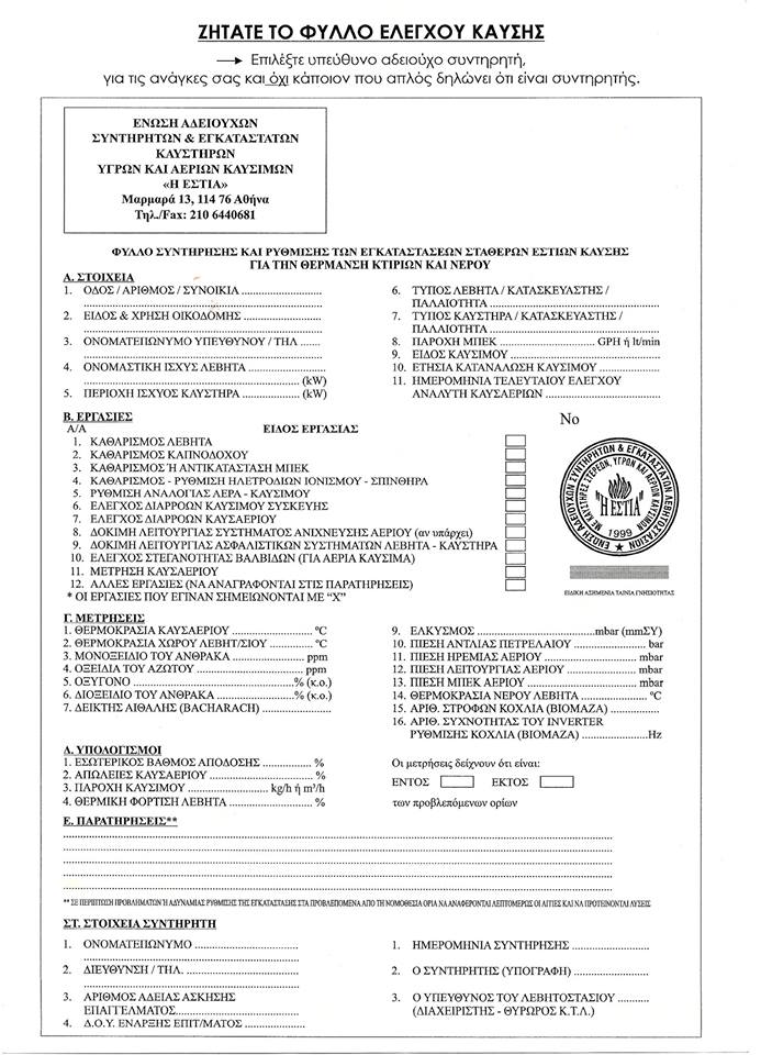 Η μη έκδοση του, σε περίπτωση ελέγχου από αρμόδια κρατική υπηρεσία, συνεπάγεται κυρώσεις και πρόστιμο. Σ’ αυτό, θα πρέπει να αναγράφονται τα πλήρη στοιχεία της εγκατάστασης, της διαχείρισης, αναλυτικά τα παράγωγα καύσης, η παροχή- κατανάλωση καυσίμου, καθώς και τα στοιχεία του τεχνίτη, η άδεια ασκήσεως επαγγέλματος του και βεβαίως να φέρει την υπογραφή και την σφραγίδα του.Ο υπεύθυνος λεβητοστασίου οφείλει να φροντίζει για την ετήσια συντήρηση του καυστήρα , να λαμβάνει το φύλλο ελέγχου από τον πιστοποιημένο τεχνικό και να το διατηρεί μέχρι την λήξη του.